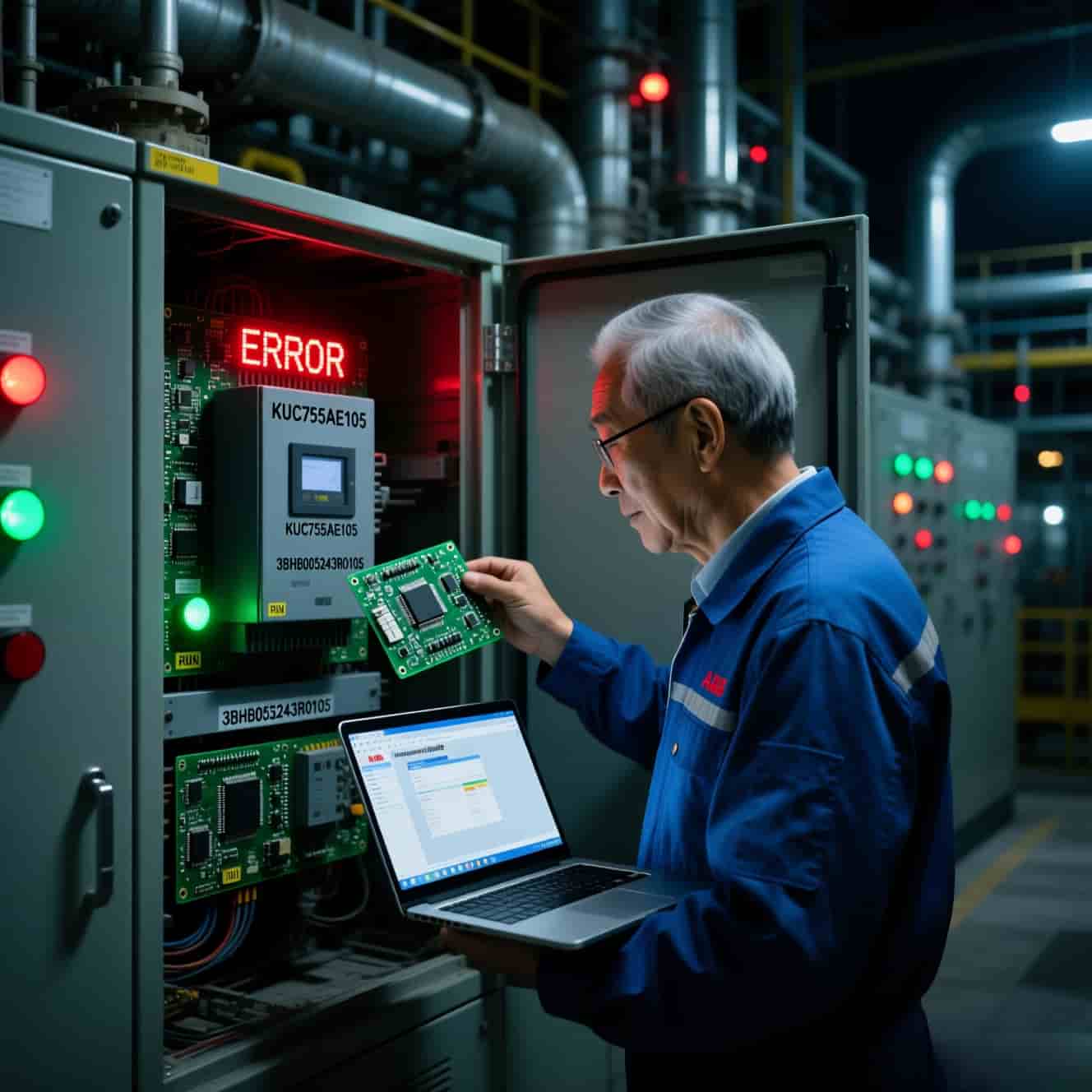 Sau khi tuân thủ nghiêm ngặt các quy trình an toàn của LOTO và xác nhận rằng hệ thống đã tắt nguồn hoàn toàn, Xiao Li mở tủ điều khiển. Anh ta nhận thấy đèn xanh RUN trên KUC755AE105 không sáng, trong khi đèn đỏ ERRO đang nhấp nháy. Dựa trên kinh nghiệm nhiều năm của mình, anh đánh giá rằng thỉnh thoảng có lỗi ở chip giao tiếp hoặc phần sụn của bảng điều khiển.