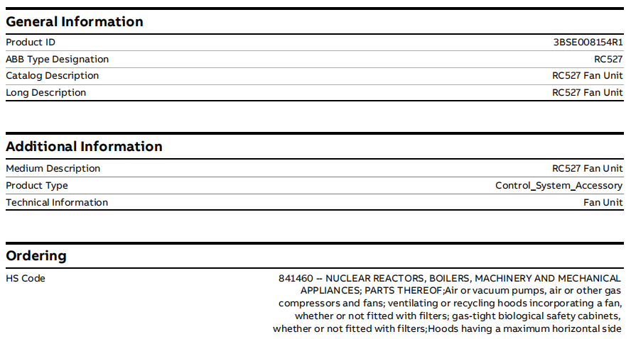 RC527 là thành phần tản nhiệt quan trọng trong hệ thống điều khiển quy trình phân tán ABB Advant Master. 3BSE008154R1 được định nghĩa là "Bộ phận quạt" và chức năng cốt lõi của nó là cung cấp khả năng làm mát không khí cưỡng bức cho các mô-đun điện tử công suất cao được lắp đặt trong Khung thiết bị của AC 400, đảm bảo toàn bộ hệ thống điều khiển có thể hoạt động ổn định và đáng tin cậy trong thời gian dài dưới nhiệt độ môi trường quy định.