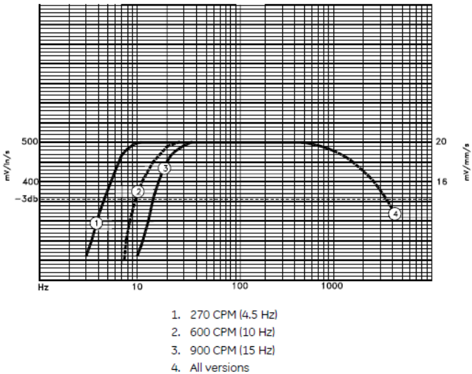 Đáp ứng tần số: Với tùy chọn A đặt thành 01 (tần số tối thiểu 4,5 Hz), phạm vi phản hồi là 4,5 Hz đến 1000 Hz (270 đến 60.000 cpm), điển hình ± 0,3 dB.