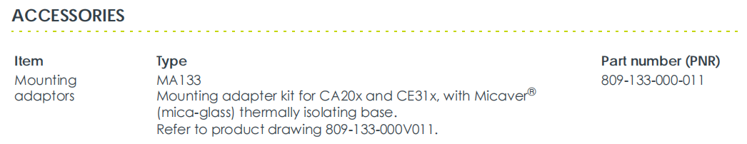Bộ điều hợp lắp đặt MA133 bao gồm đế cách nhiệt Micaver® (thủy tinh mica). Điều quan trọng là phải lắp đặt cảm biến trên bề mặt có nhiệt độ cao (>120°C), vì nó có thể bảo vệ đế cảm biến và máy khỏi sự truyền nhiệt và cách ly điện.