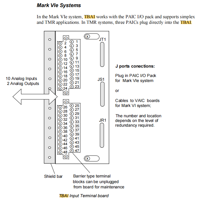 Hỗ trợ các hoạt động trao đổi nóng Trong các hệ thống Mark VIe được cấu hình với các mô-đun VAIC dự phòng, nếu cần thay thế bảng đầu cuối TBAI, nó có thể được ngắt kết nối khỏi cáp xoắn và thay thế trong khi hệ thống đang chạy, đạt được khả năng bảo trì "không có thời gian ngừng hoạt động" thực sự, tuân theo các quy trình an toàn nghiêm ngặt.