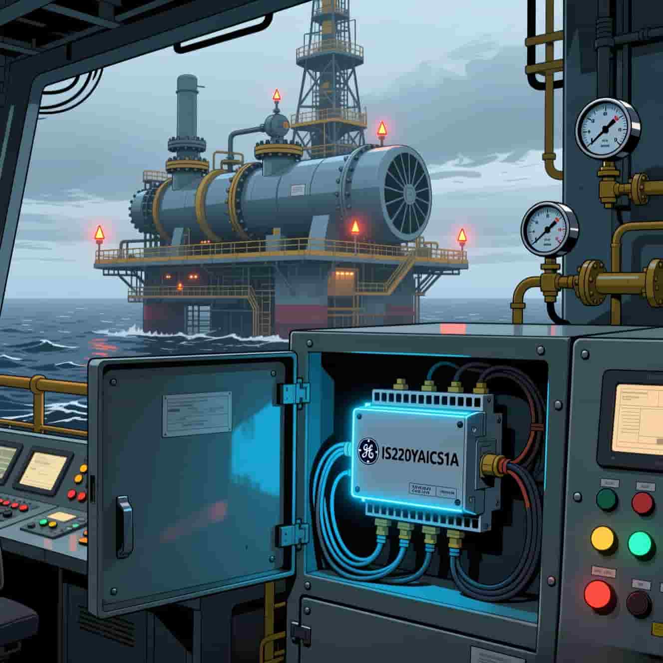 Một bộ hệ thống thiết bị an toàn độc lập bao gồm các mô-đun IS220YAICS1A đã được triển khai tại đây để liên tục giám sát nhiều thông số quan trọng của máy nén, chẳng hạn như nhiệt độ vòng bi, áp suất dầu bôi trơn và áp suất đầu ra. Do nguy cơ tiềm ẩn rò rỉ khí đốt tự nhiên trên giàn khoan, toàn bộ khu vực được phân loại là vùng nguy hiểm Vùng 2. Với chứng nhận ATEX của Ex ic nA[ic] IIC T4 Gc, IS220YAICS1A có thể được lắp đặt an toàn trong tủ điều khiển gần địa điểm mà không cần thêm các biện pháp cách ly hoặc thông gió áp suất dương.