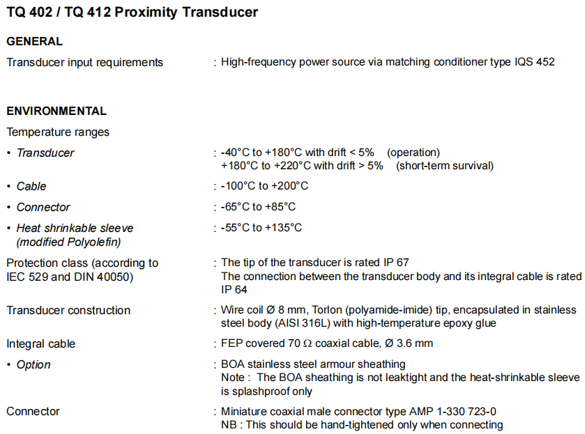 TQ402 111-402-000-013 A1-B1-C075-D000-E050-F2-G050-H05 là cảm biến tiệm cận không tiếp xúc trong dòng sản phẩm máy đo độ rung, được thiết kế đặc biệt để đo độ dịch chuyển tương đối, độ rung và vị trí có độ chính xác cao trong máy móc quay. Khi kết hợp với bộ điều chỉnh tín hiệu IQS900 và dây nối dài EA402, nó sẽ tạo thành một phần của hệ thống đo hiệu chuẩn. Hệ thống này được ứng dụng rộng rãi trong các ứng dụng chính trong sản xuất điện, dầu khí và các lĩnh vực công nghiệp để bảo vệ cơ khí và giám sát tình trạng.