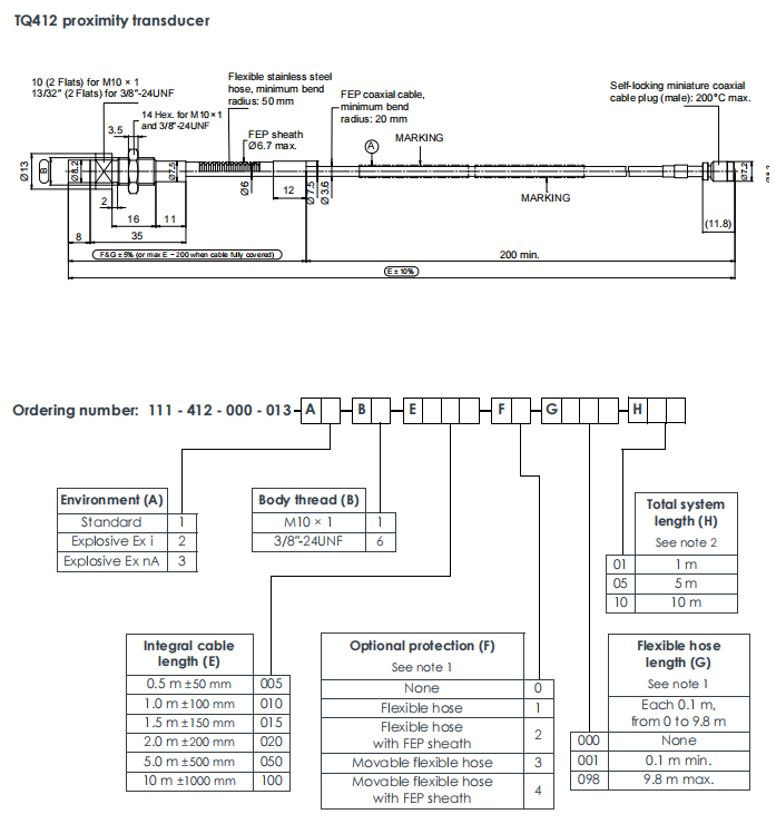 M10x1, cáp tích hợp 1m + cáp nối dài 9m, ống inox + vỏ bọc FEP (1m) |