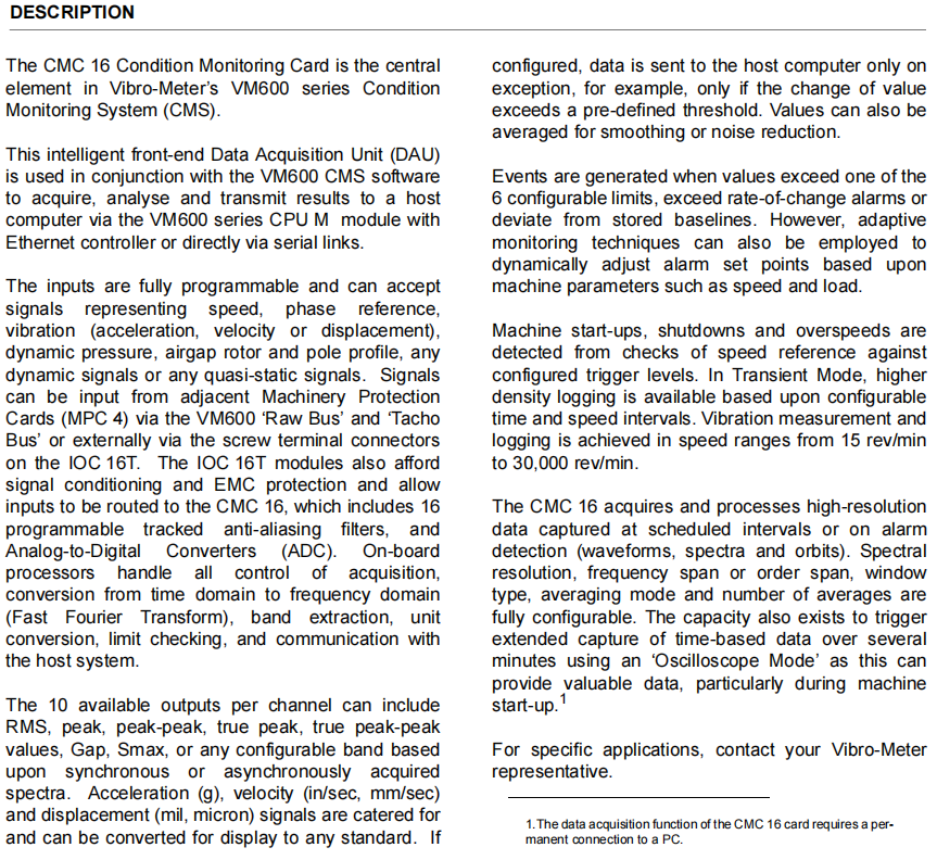 Thương hiệu: Vibro-MeterMô tả: Thẻ theo dõi tình trạngTình trạng: Thương hiệu mớiGiấy chứng nhận: THƯ BẢO HÀNH BÁO CÁO KIỂM TRA COOBảo hành: 1 nămSố lượng tồn kho: 5Thời hạn thanh toán: T/TCảng vận chuyển: Hạ MônVibro-Meter CMC16 là thiết bị thu thập dữ liệu mặt trước thông minh và hiệu suất cao được thiết kế bởi công ty Vibro-Meter của Thụy Sĩ cho hệ thống giám sát tình trạng dòng VM600 (CMS) hàng đầu của họ. Trong mẫu 200-530-012-012, 012 đại diện cho phiên bản phần mềm nhúng và 012 đại diện cho phiên bản phần cứng của nó.